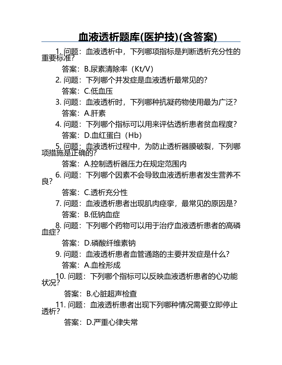 血液透析题库(医护技)(含答案)1.问题:血液透析中,下列哪项指标是判断透析充分性的重要标准?答案:B.尿素清除率(Kt/V)2.问题:下列哪个并发症是血液透析最常见的?答案:C.低血压3.问题:血液透析时,下列哪...