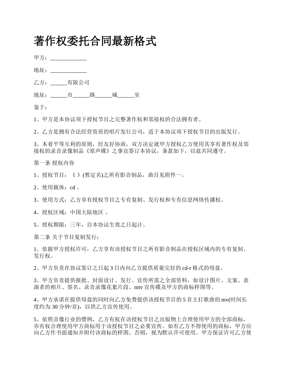 著作权委托合同最新格式甲方:_____________地址:_____________乙方:______有限公司地址:______市______路______城______室鉴于:1、甲方是本协议项下授权节目之完整著作权和邻接权的合法拥有者。2、乙方是拥...