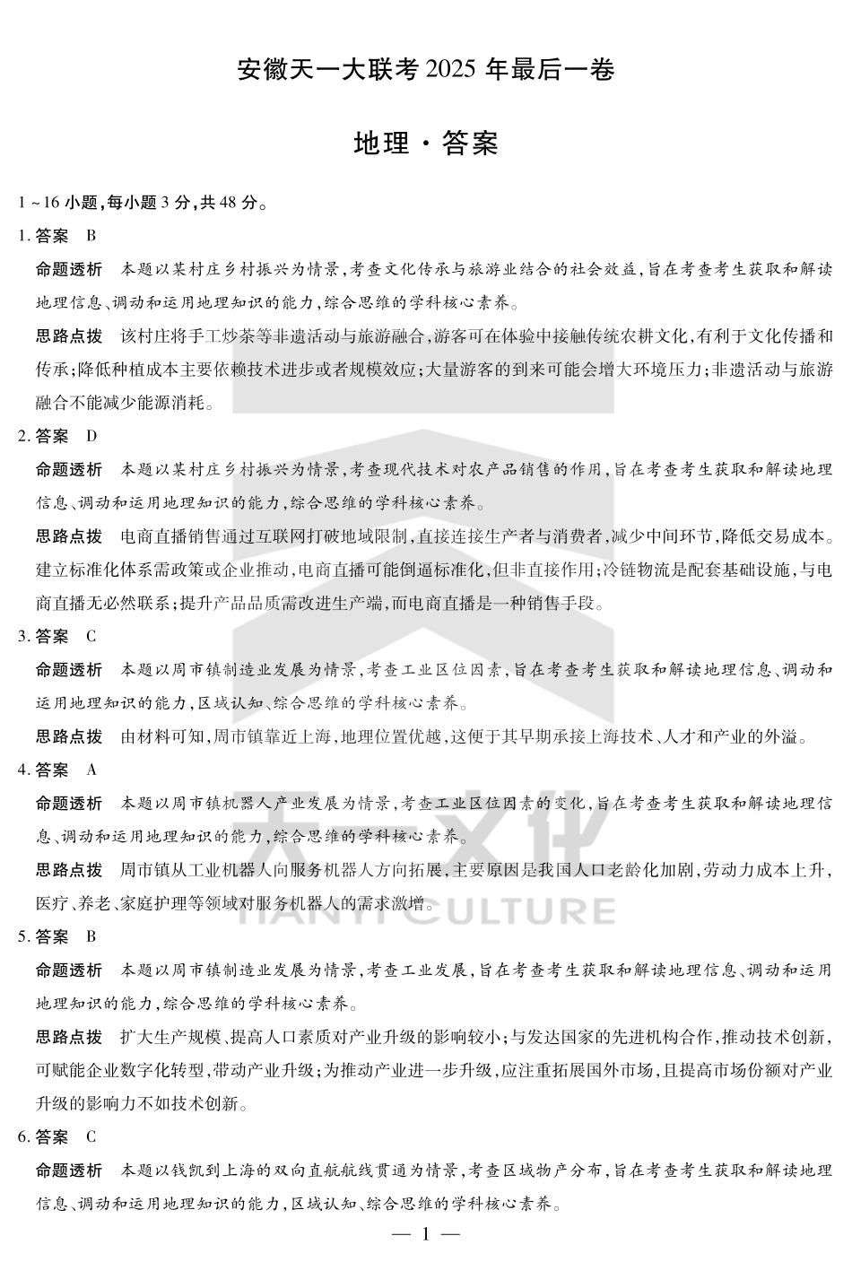 【地理试卷答案】安徽省天一大联考2025年(届)高考高三年级最后一卷(5.22-5.24).pdf_第1页