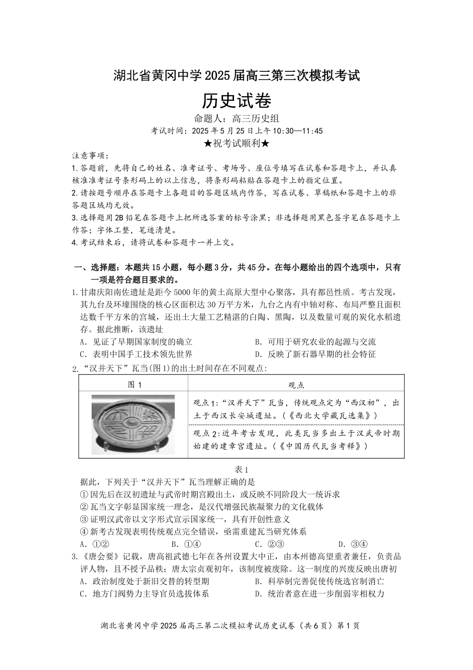 湖北省黄冈中学2025届高三第二次模拟考试历史试卷(共6页)第1页湖北省黄冈中学2025届高三第三次模拟考试历史试卷命题人:高三历史组考试时间:2025年5月25日上午10:30—11:45★祝考试顺利★注意事项:1.答题前,...