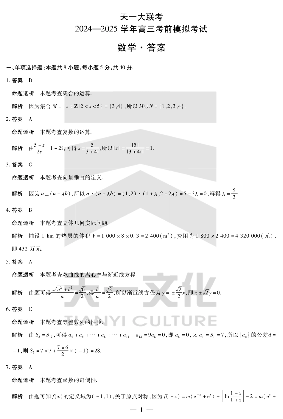 数学河南省天一大联考 2024-2025学年高三考前模拟考试答案.pdf_第1页