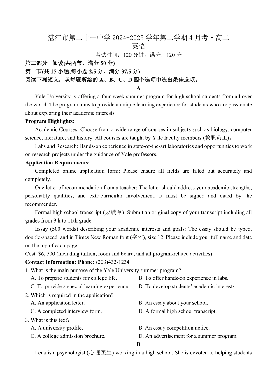 湛江市第二十一中学2024-2025学年第二学期4月考·高二英语考试时间:120分钟,满分:120分第二部分阅读(共两节,满分50分)第一节(共15小题;每小题2.5分,满分37.5分)阅读下列短文,从每题所给的A、B、C、D四个选...