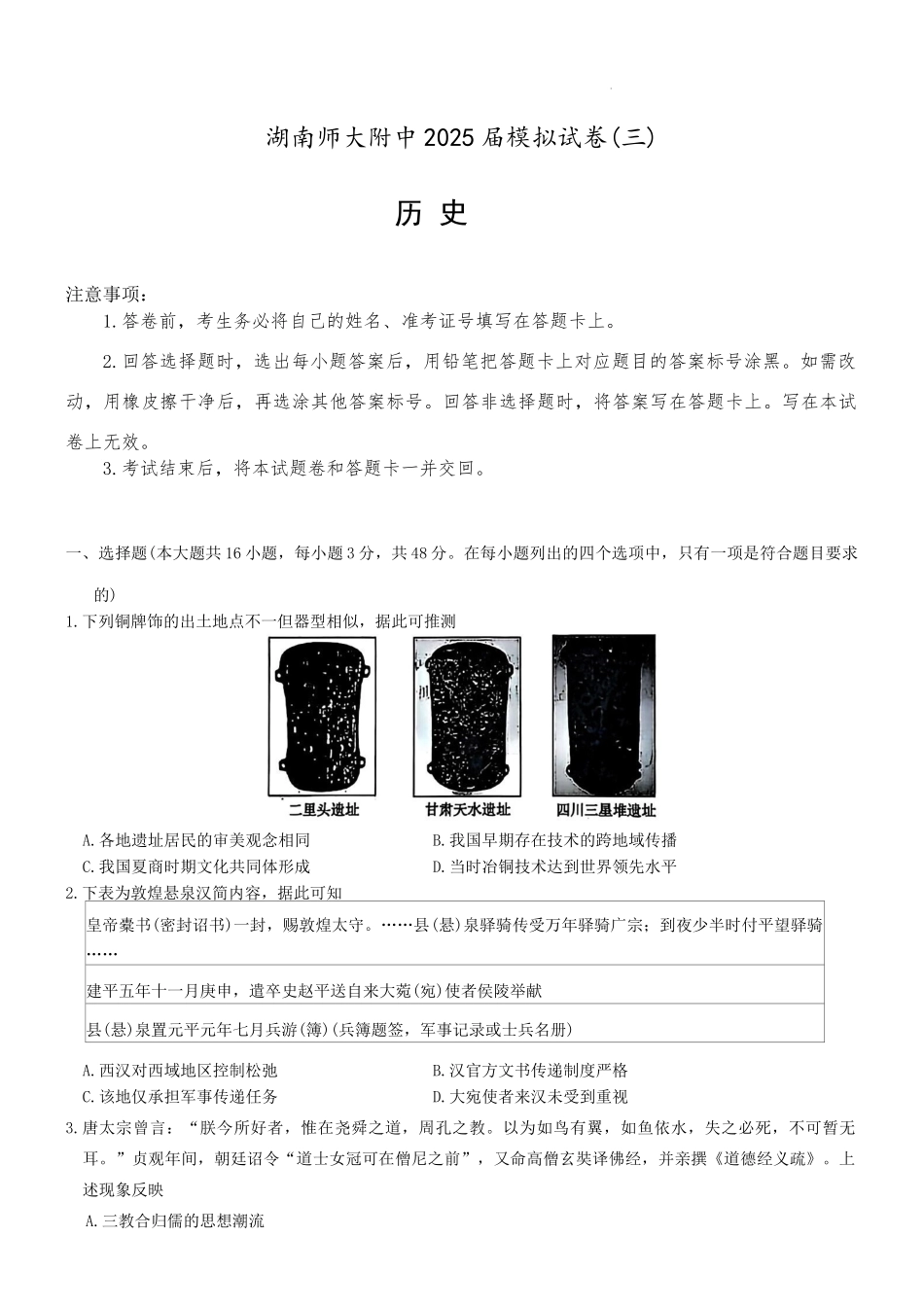 湖南师大附中2025届模拟试卷(三)历史注意事项:1.答卷前,考生务必将自己的姓名、准考证号填写在答题卡上。2.回答选择题时,选出每小题答案后,用铅笔把答题卡上对应题目的答案标号涂黑。如需改动,用橡皮擦干净...
