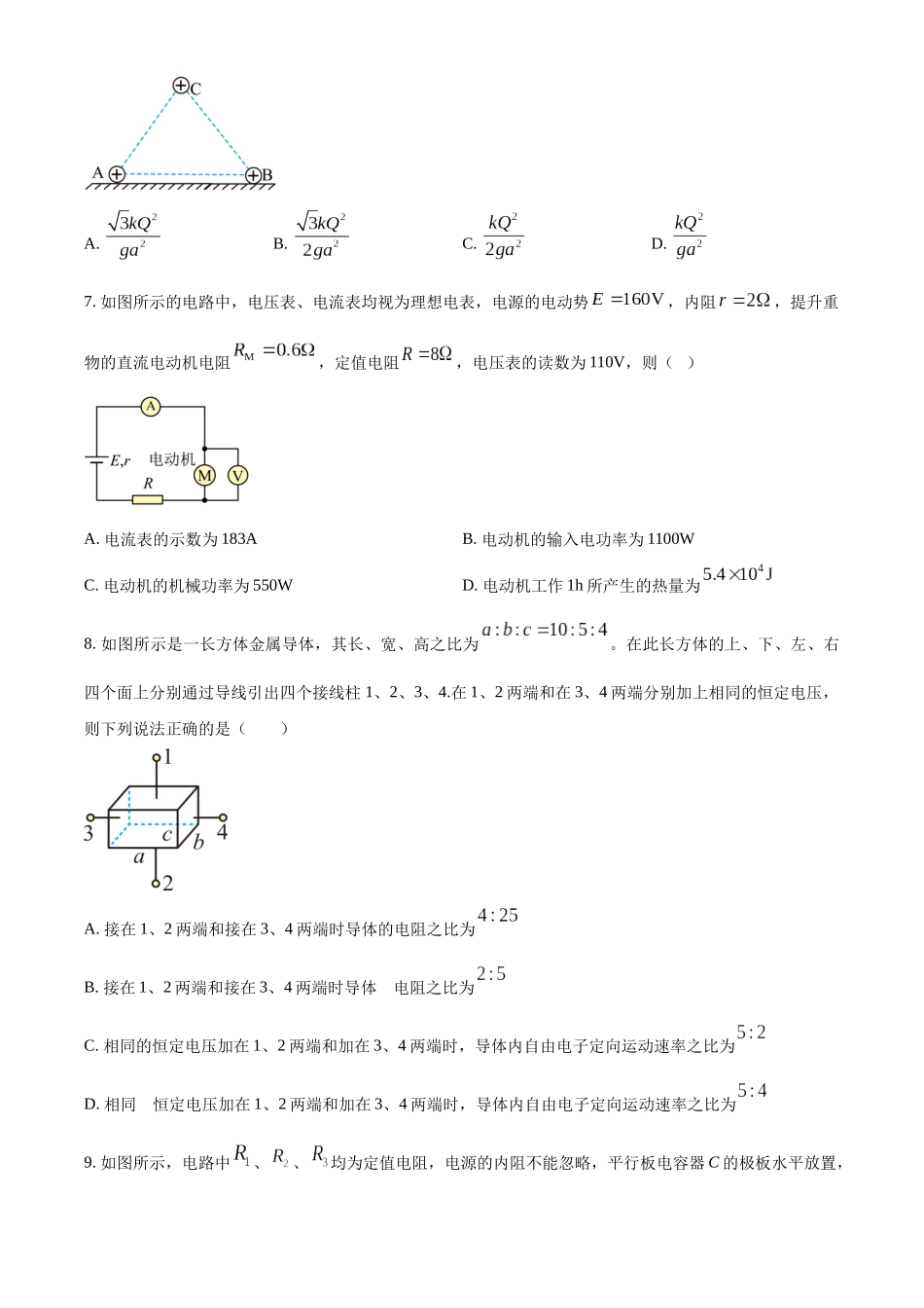 2024~2025学年度第一学期高二年级期中考试物理考生注意:1.本试卷分选择题和非选择题两部分。满分100分,考试时间75分钟。2.答题前,考生务必用直径0.5毫米黑色墨水签字笔将密封线内项目填写清楚。3.考生作答时,...