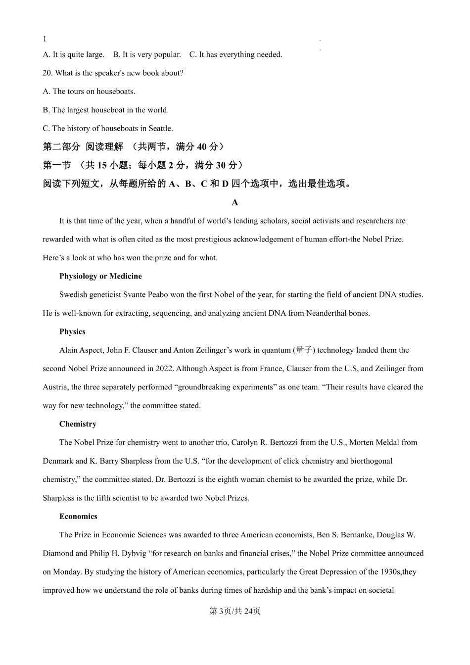 1第1页/共24页学科网(北京)股份有限公司2024-2025-1高二年级9月学情检测英语试卷(试卷满分150分,考试时间120分钟)第一部分:听力(共两节,满分20分)第一节(共5小题;每小题1分,满分5分)听下面5段对话。...