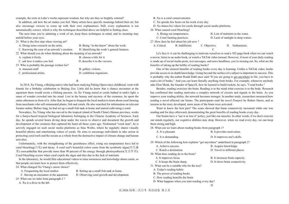 高2026届第二次月考英语试卷第1页四川省万源中学高2026届第二次月考试题(高二.上)英语第一部分听力(共两节,满分30分)第一节(共5小题;每小题1.5分,满分7.5分)听下面5段对话。每段对话后有一个小题,从题中所给...