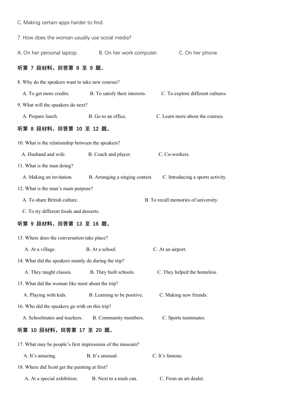 高2023级高二(上)10月月考英语试题第一部分听力(共两节满分30分)第一节(共5小题;每小题1.5分,满分7.5分)听下面5段对话。每段对话后有一个小题,从题中所给的A、B、C三个选项中选出最佳选项,并标在试卷的...