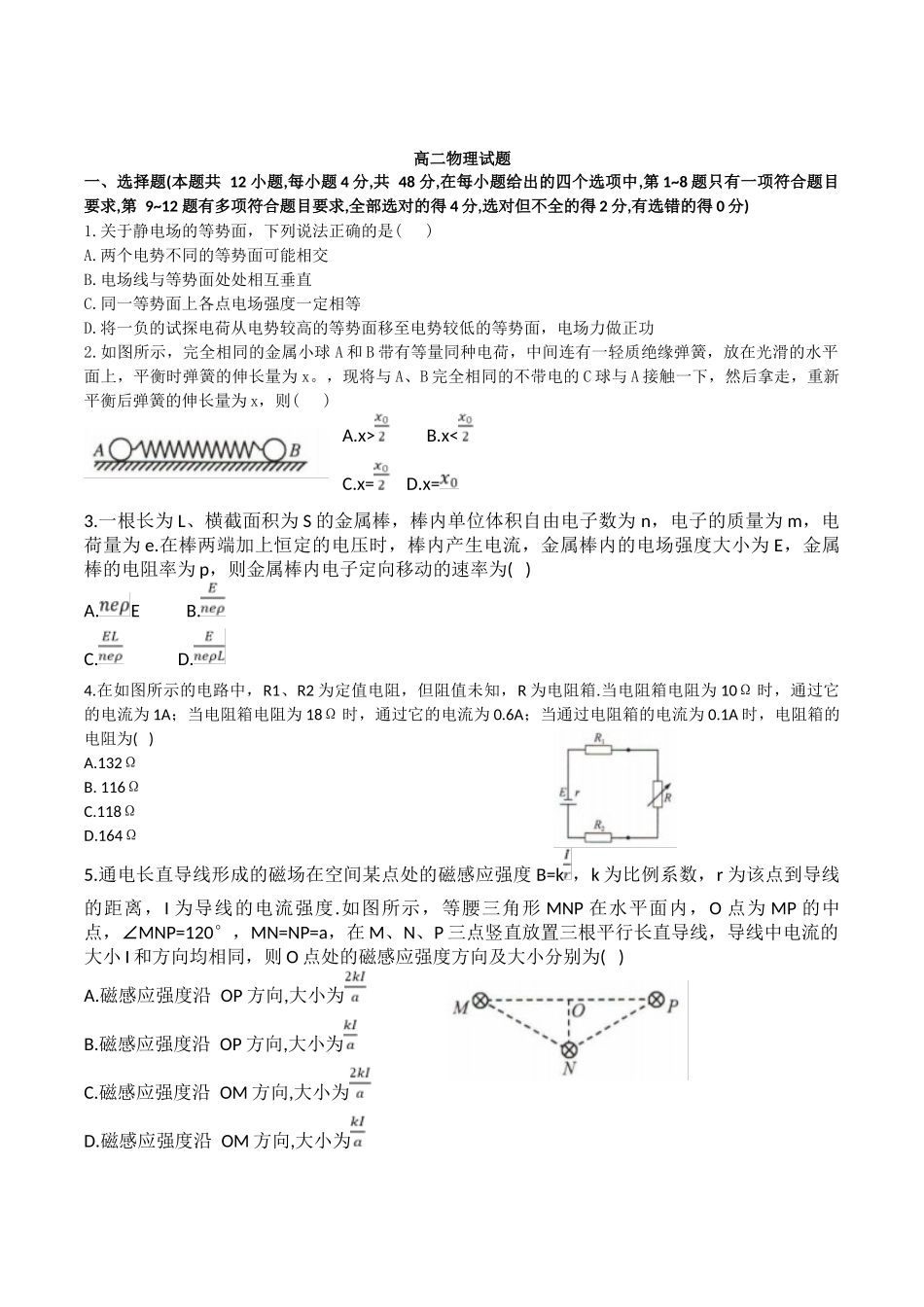 高二物理试题一、选择题(本题共12小题,每小题4分,共48分,在每小题给出的四个选项中,第1~8题只有一项符合题目要求,第9~12题有多项符合题目要求,全部选对的得4分,选对但不全的得2分,有选错的得0分)1.关于静电场的等...
