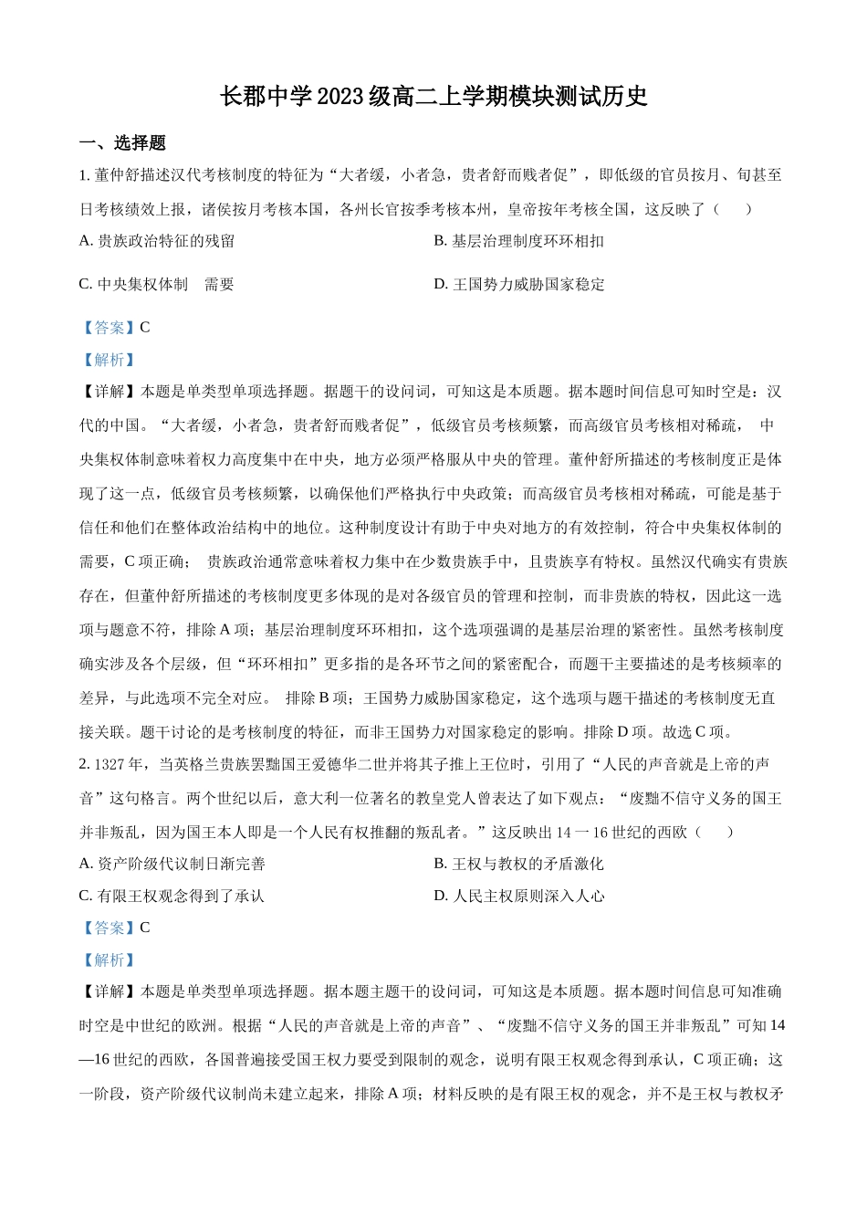 湖南省长沙市长郡中学2024-2025学年高二上学期第一次月考历史试题含解析.docx_第2页