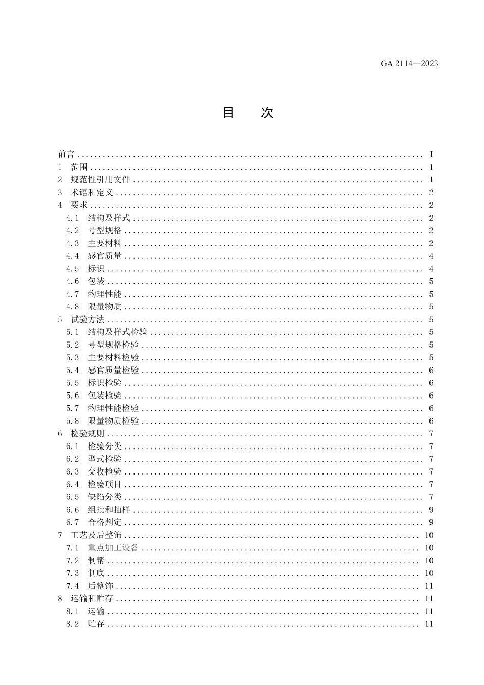 IICS61.060CCSA94中华人民共和国公共安全行业标准GAGA2114—2023警鞋礼服女皮鞋Policeshoes—Ceremonialleathershoesforwomen2023—11—20发布2024—01—01实施中华人民共和国公安部发布GA2114—2023目次前言.......