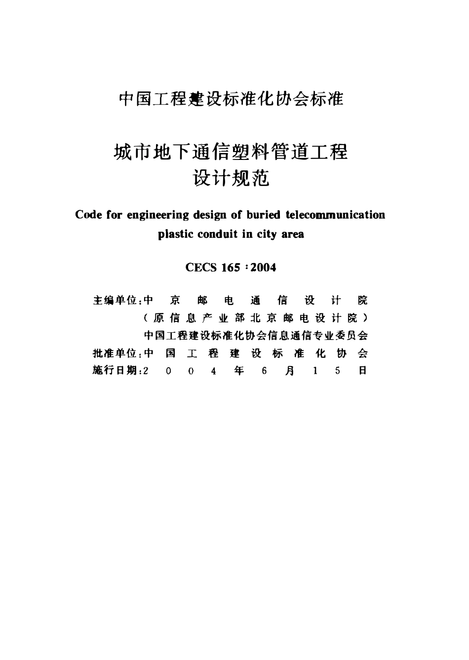 邑CECS165:2004中囚l程建设标准化协会标准城市地下通信塑料管道工程设计规范Codeforengineeringdesignofburiedtelecommunicationplasticconduitincityarea中国工程建设标准化协会标准城市地下通信塑料管道工程设...