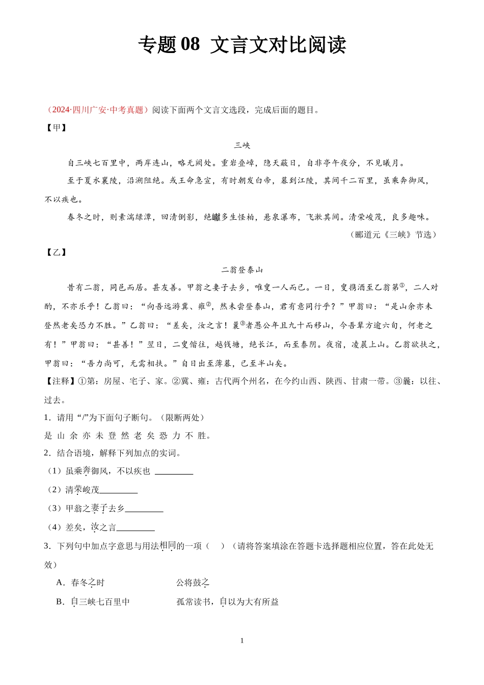 专题08文言文对比阅读(2024·四川广安·中考真题)阅读下面两个文言文选段,完成后面的题目。【甲】三峡自三峡七百里中,两岸连山,略无阙处。重岩叠嶂,隐天蔽日,自非亭午夜分,不见曦月。至于夏水襄陵,沿溯...