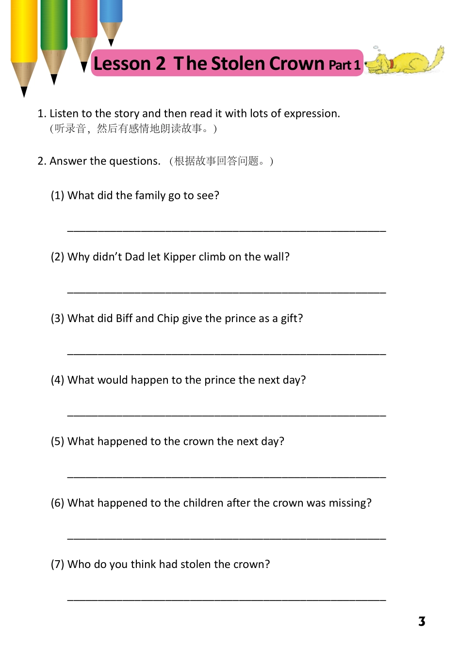 3Lesson2TheStolenCrownPart11.Listentothestoryandthenreaditwithlotsofexpression.(听录音,然后有感情地朗读故事。)2.Answerthequestions.(根据故事回答问题。)(1)Whatdidthefamilygotosee?______________...