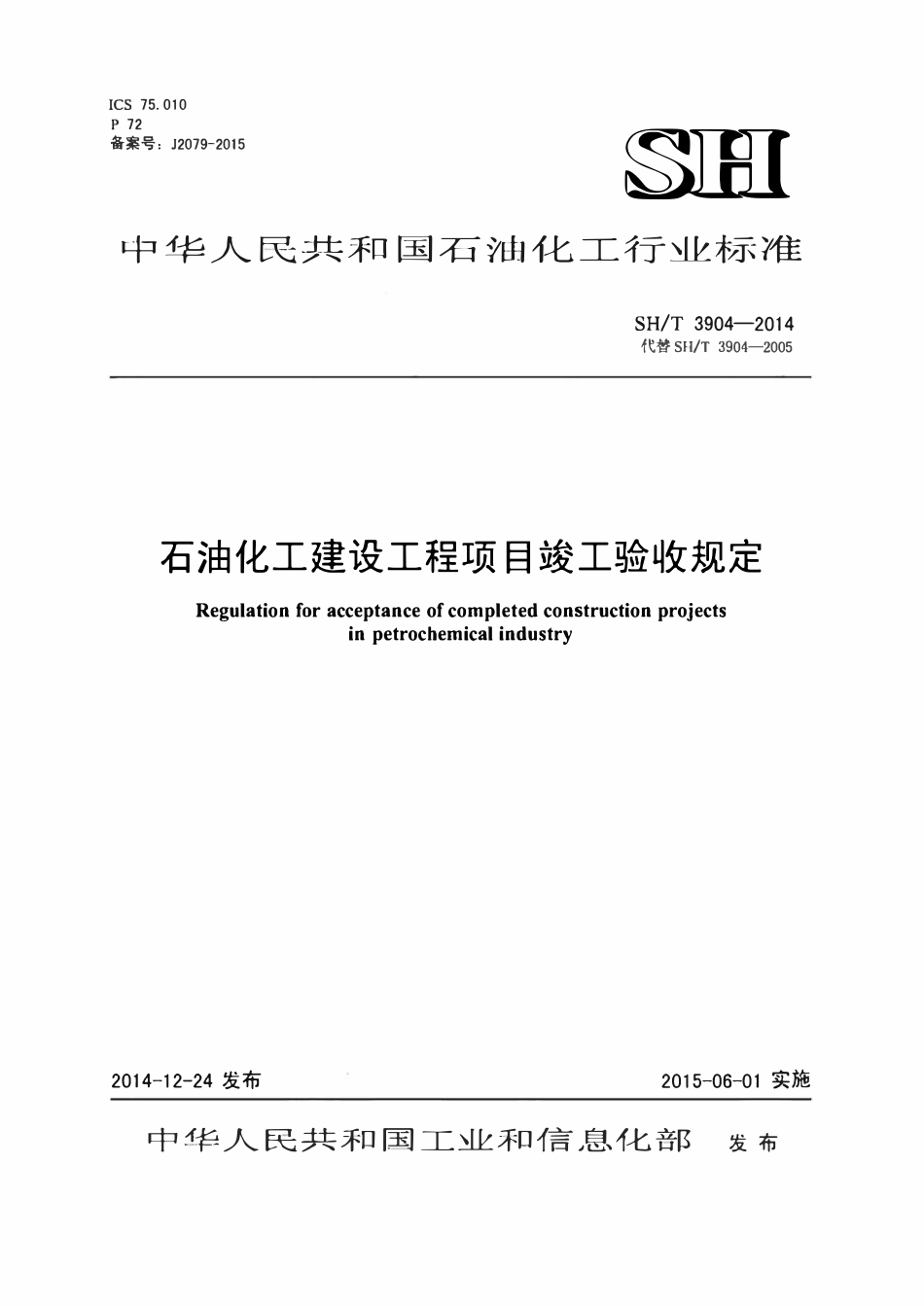 ICS75.010p72备案号:J2079-2015四中华人民共和国石油化工行业标准SHIT3904—2014代替SH/T3904一2005石油化工建设工程项目竣工验收规定Regulationforacceptanceofcompletedconstructionprojectsinpetrochemicalin...