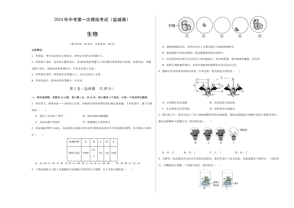 2024年中考第一次模拟考试(盐城卷)生物(考试时间:45分钟试卷满分:30分)注意事项:1.答卷前,考生务必将自己的姓名、准考证号填写在答题卡上。2.回答第Ⅰ卷时,选出每小题答案后,用2B铅笔把答题卡上对应...