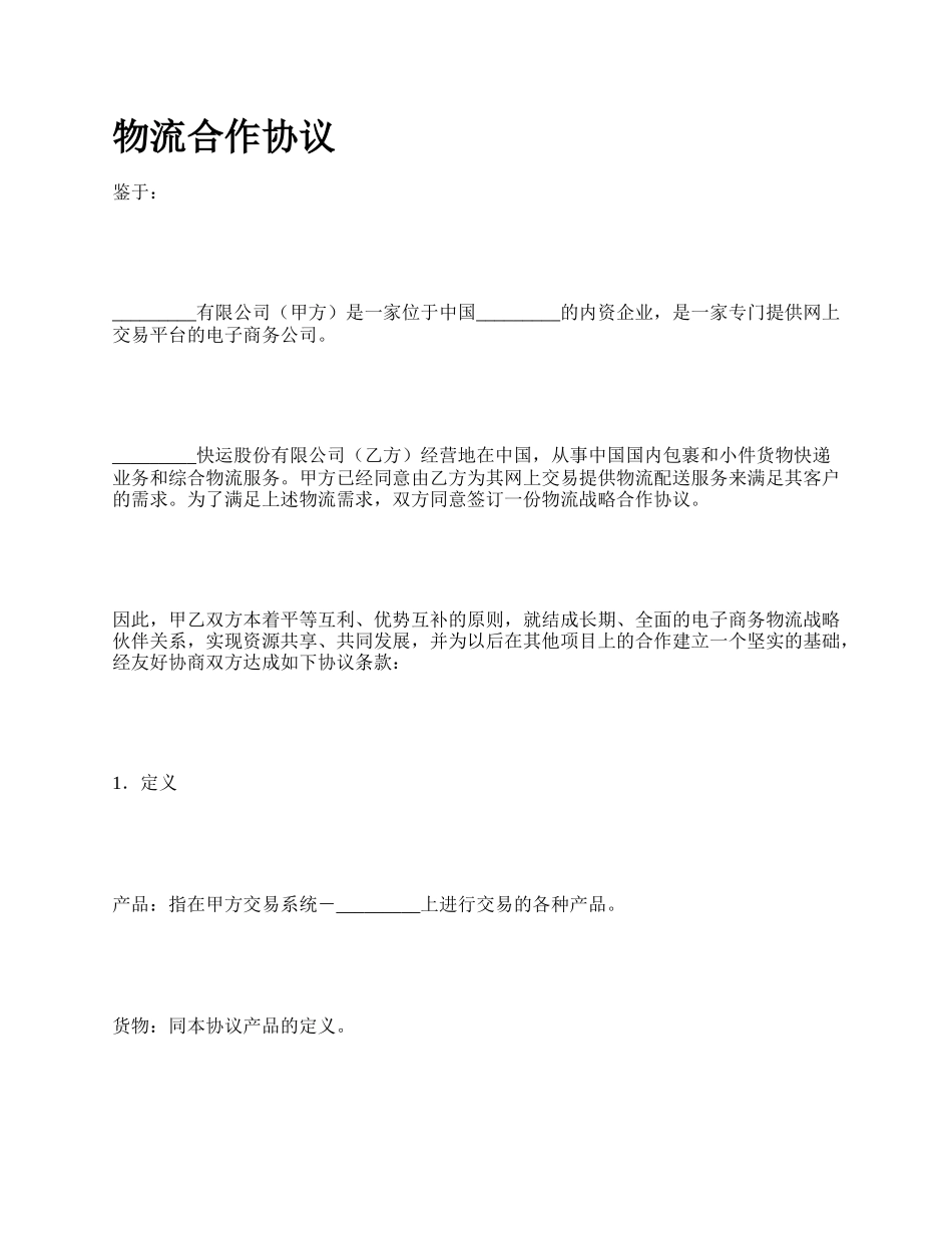 物流合作协议鉴于:_________有限公司(甲方)是一家位于中国_________的内资企业,是一家专门提供网上交易平台的电子商务公司。_________快运股份有限公司(乙方)经营地在中国,从事中国国内包裹和小件货物快递...